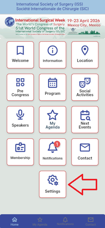 1.- Enter the ISW 2026 app and select the "Setting" button.